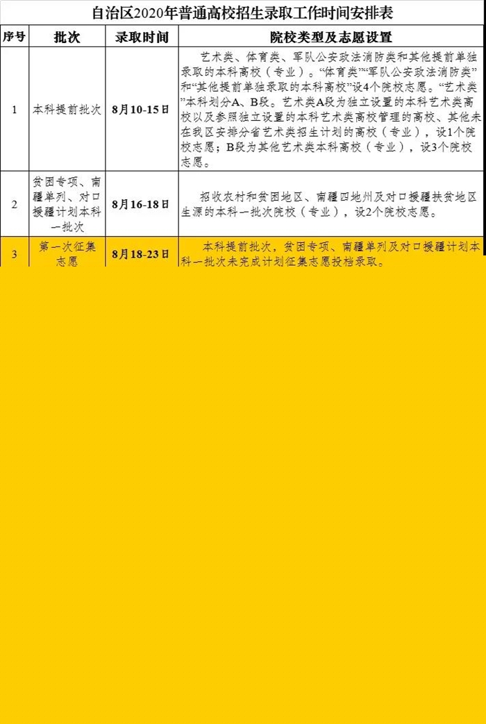 自治區(qū)2020年普通高校招生錄取工作將于8月10日正式開始,預(yù)計9月27日結(jié)束。錄取共分本科提前批次,貧困專項、南疆單列及對口援疆計劃本科一批次,高校專項計劃批次(設(shè)在本科一批次前),本科一批次,貧困專項、南疆單列及對口援疆計劃本科二批次,本科二批次,高職(??疲┨崆芭?,高職(??疲┡蔚?個批次進行。錄取期間共安排了5次征集志愿?!叭I呗殹迸闻c高職(??疲┨崆芭武浫⊥瑫r進行。