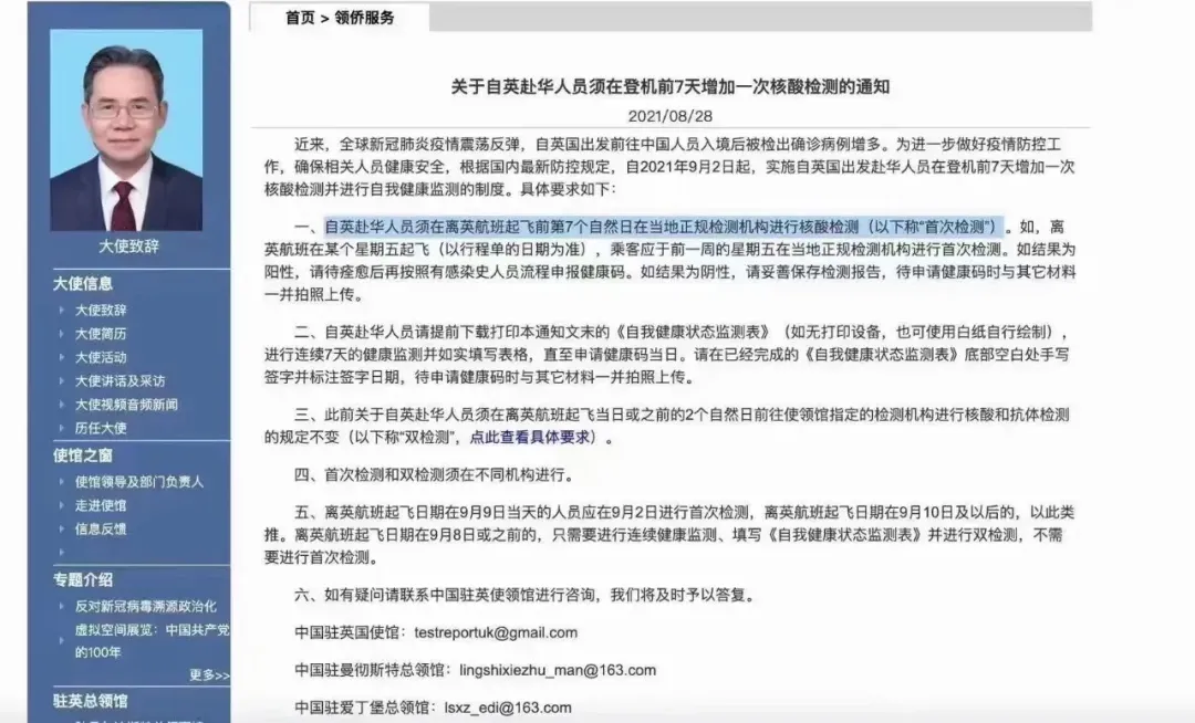 此前關(guān)于自英赴華人員須在離英航班起飛當(dāng)日或之前的2個(gè)自然日前往使領(lǐng)館指定的檢測機(jī)構(gòu)進(jìn)行核酸和抗體檢測的規(guī)定不變。