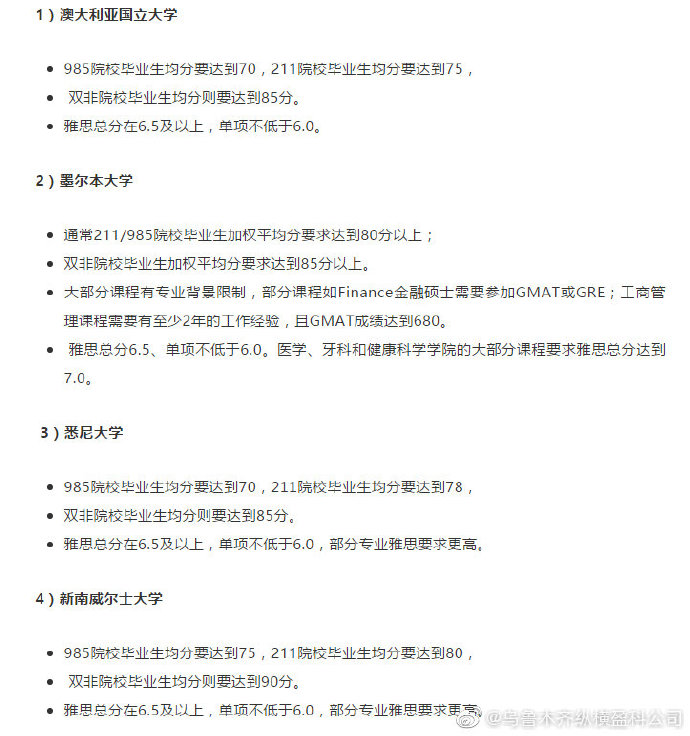下面附部分英國(guó)及澳洲大學(xué)錄取要求,各位想申請(qǐng)名校的可以參考對(duì)照一下自己的條件(可能會(huì)根據(jù)學(xué)生個(gè)案調(diào)整)。