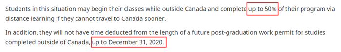 基于加拿大移民局原有的政策,一般網(wǎng)課是不計入PGWP的,但是由于疫情對留學生產生了重大的影響,外加受到健康和旅行的限制,很多留學生無法順利返校,因此,加拿大移民部允許留學生在2020年秋季學年留在海外完成50%的線上課程,并在之后返回加拿大完成整個課程后,仍有資格獲取得畢業(yè)工簽。