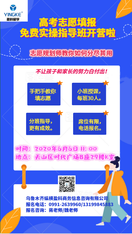 更多留學、高考相關資訊,請關注微信公眾號“新疆盈科留學”或加入微信群“盈科高考志愿填報公益講座沙龍”。