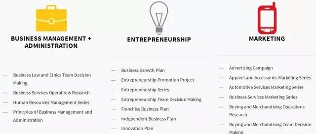 DECA涉及60多個比賽項目,涵蓋市場營銷、商業(yè)管理、金融、酒店管理和旅游等類別。比賽項目如下圖所示。