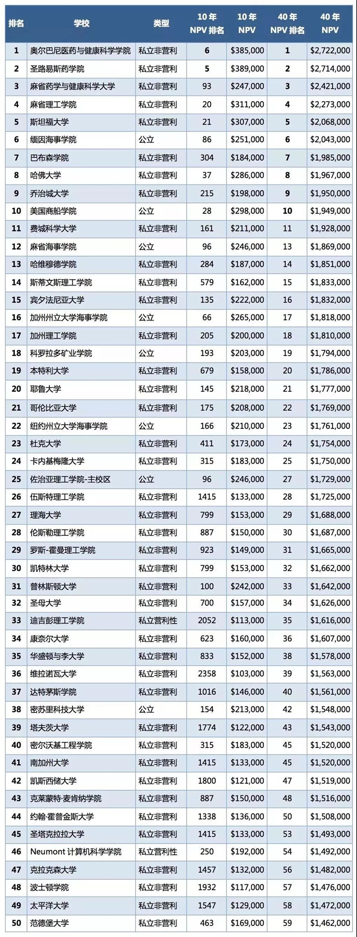 常春40年NPV最高的前50所大學(xué)藤院校自然也表現(xiàn)不俗,哈佛大學(xué)、普林斯頓大學(xué)、耶魯大學(xué)、哥倫比亞大學(xué)等等均位列前茅。