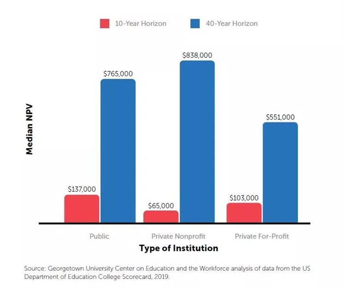 1. 雖然學(xué)制較短的社區(qū)大學(xué)在短期NPV中表現(xiàn)不俗,說明本身學(xué)費(fèi)便宜,加上學(xué)生短時間內(nèi)就能畢業(yè)開始就業(yè),但是在長期NPV中卻被耗時較長的4年制學(xué)士項目(bachelor)超趕。
