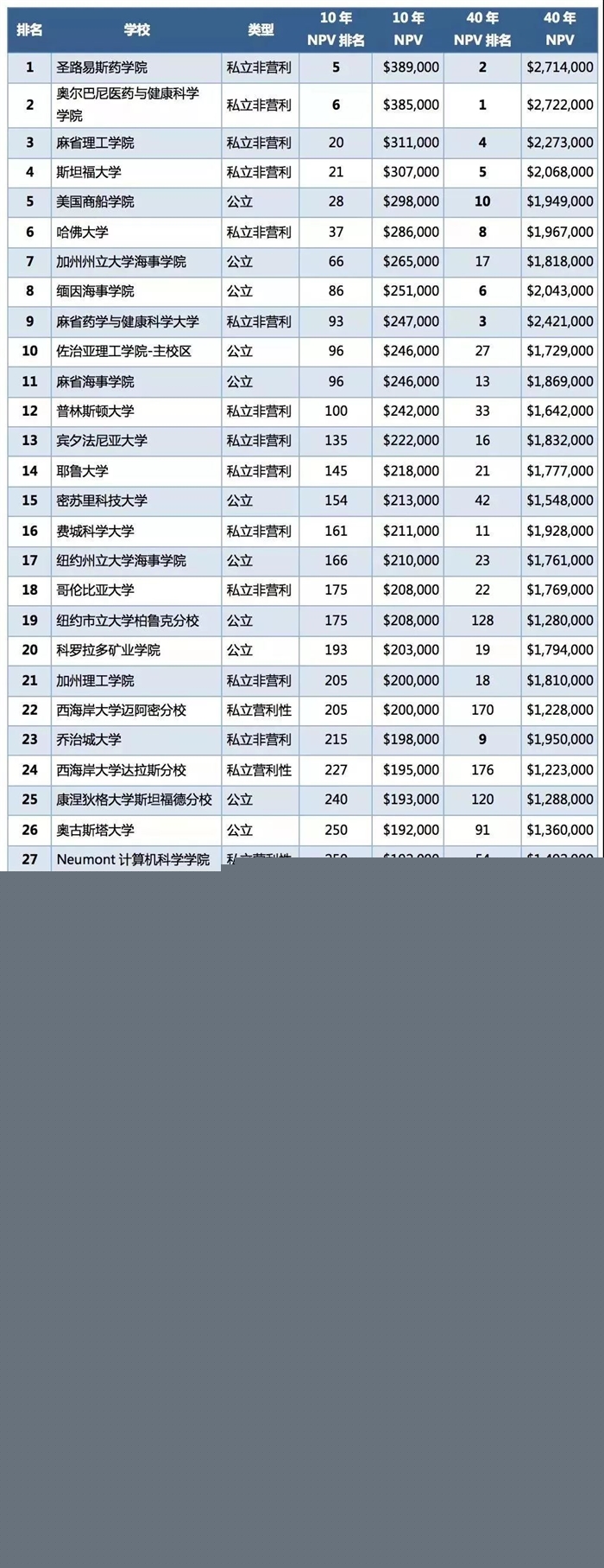 短期和長期NPV差距最大的是斯蒂文斯理工學(xué)院,它的10年NPV排名為579名,遠(yuǎn)遠(yuǎn)比不上那些社區(qū)大學(xué)短期項目,而40年NPV排名則一下子躍升至第15名,成為長期投資回報率最高的學(xué)校之一。